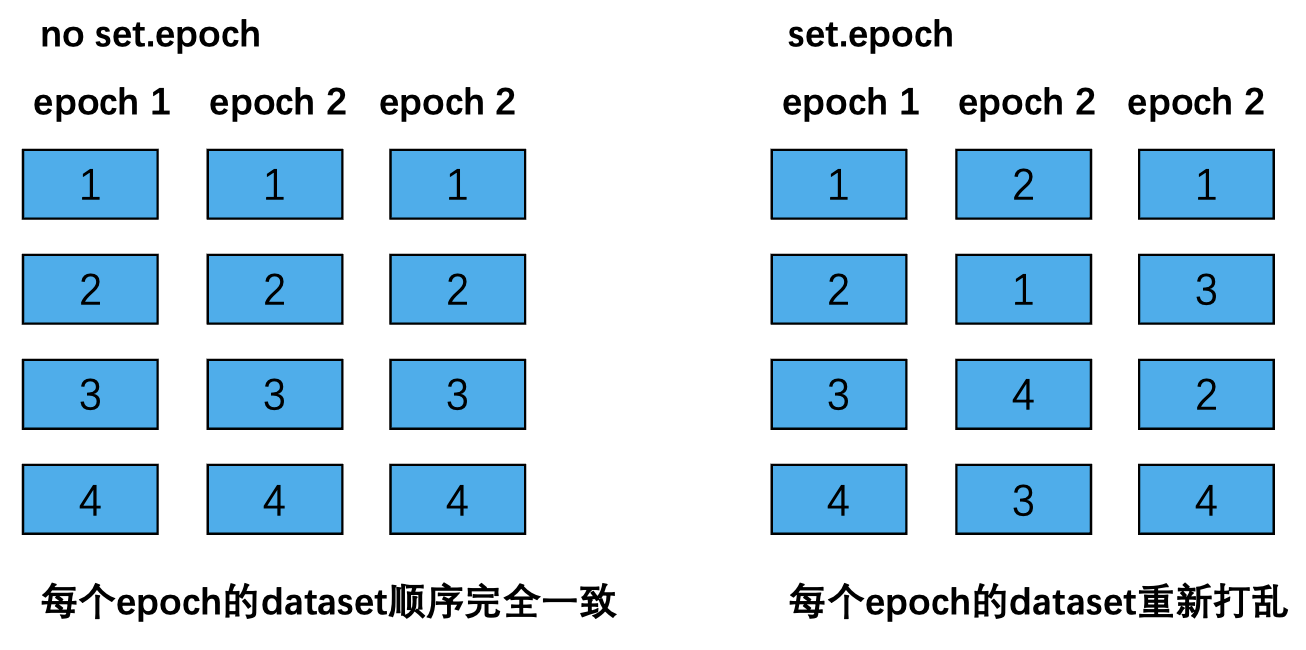 对于上述输出,当不使用set.epoch时,两个epoch的cuda:0中的数据顺序是一致的,而使用set.epoch时,两个epoch的cuda:0中的数据不同,也就是说,set.epoch在每个epoch设置了不同的随机种子