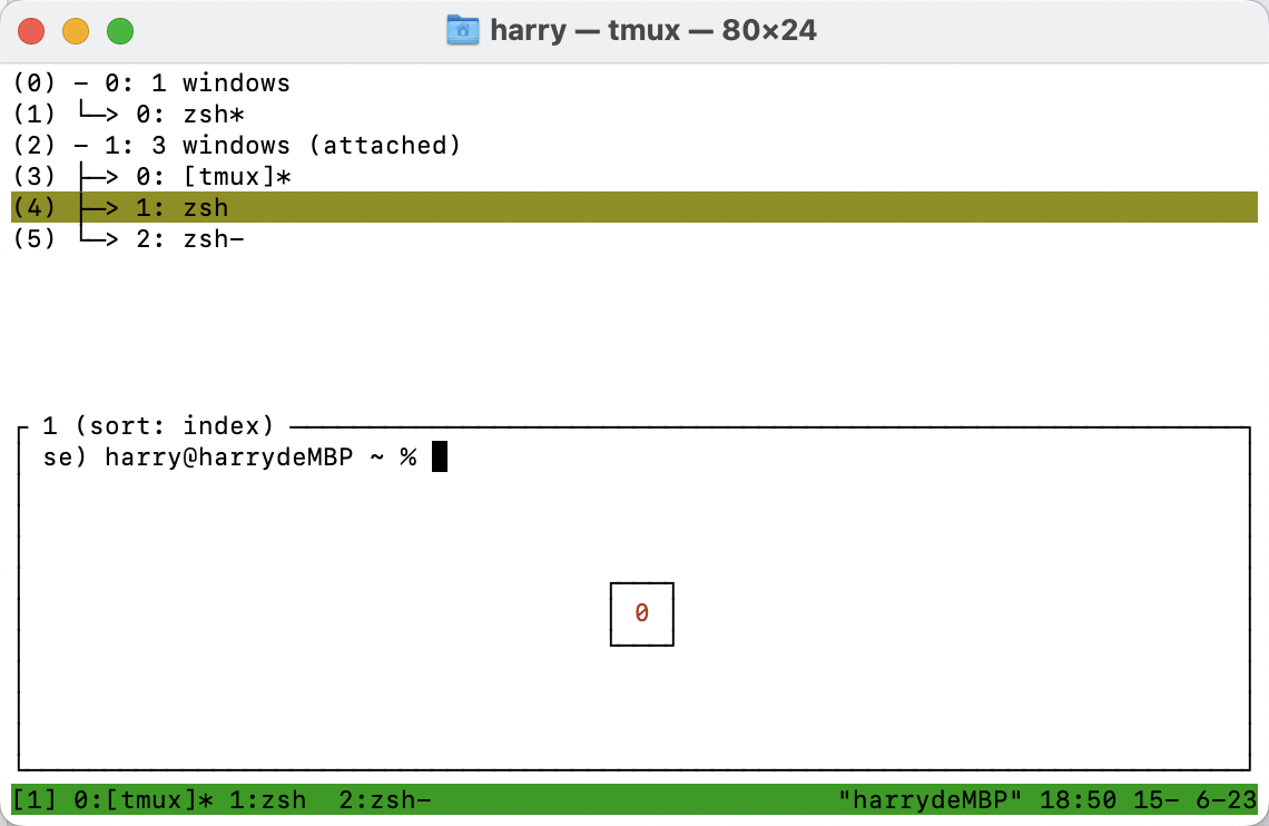 下面展示了切换window的状态,即ctrl+b+w,从列表中可以看出有两个session,session0只有一个window,session1有3个window