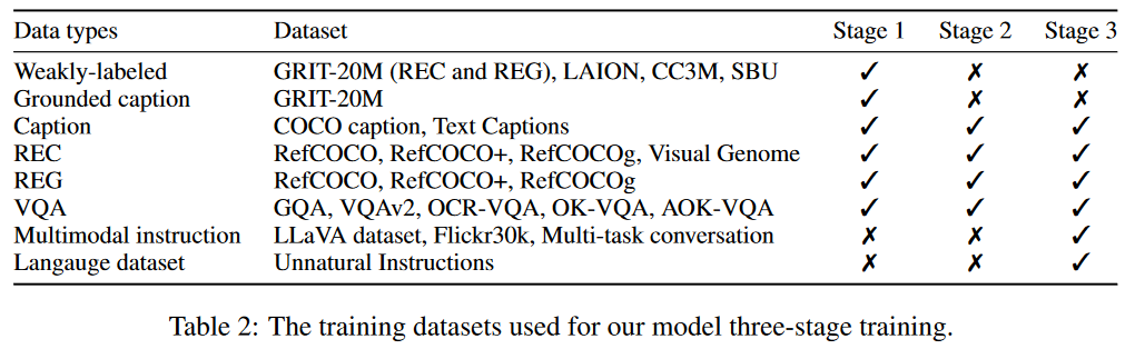 数据集:弱标记数据集(LAION,CC3M,SBU和GRIT-20M),细粒度数据集(COCO caption,text captions,RefCOCO,RefCOCO+,RefCOCOg,ReferCOCO,GQA,VQA-v2,OCR-VQA,OK-VQA,AOK-VQA)