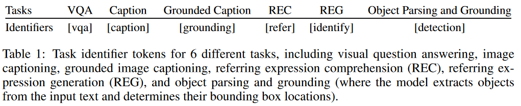 然而,由于不同任务之间的复杂继承关系,相同的用户指令在不同任务中会有不同的理解,例如“tell me the location of a person”,在referring expression comprehension中会回答一个人以及相应的bbox;在visual question-answering任务中可能会用人的自然语言描述一下物体的空间位置;对于person detection任务,模型可能会识别每个人的空间位置。为了减轻这种歧义问题,本文提出了一个task-oriented instruction,即对于每一个任务,提出了一个task identifier token,例如对于visual question answering任务,提供了一个**[vqa] identifier token**,在训练过程中,一共有留个task identifier token。